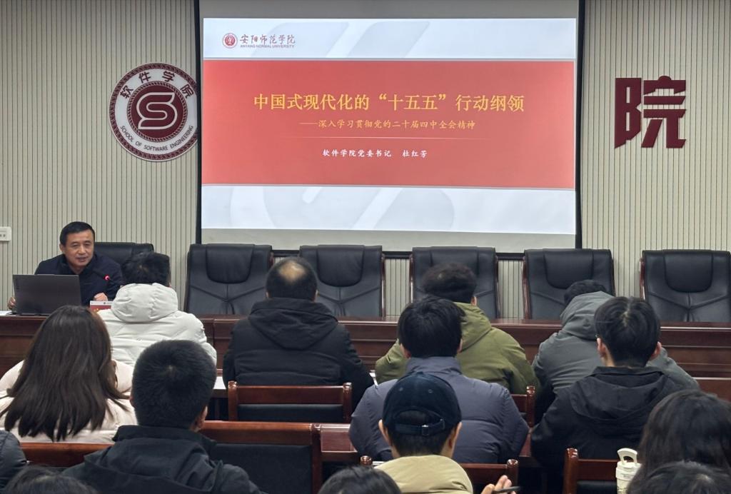 为全面深入学习贯彻党的二十届四中全会精神,12月19日下午,软件学院党委在文明大道校区教学楼202会议室举行党的二十届四中全会精神宣讲报告会。学校党的二十届四中全会精神宣讲团成员、软件学院党委书记杜红芳作宣讲,软件学院师生党员代表参加会议。