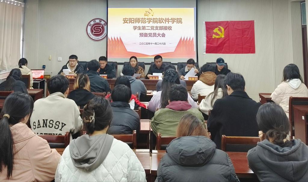 11月28日,学生第二党支部在教学楼202会议室召开预备党员接收大会。软件学院党委书记杜红芳,学生第二党支部全体委员出席会议,2025级辅导员段志文列席会议,学生党员参加会议。支部书记郭岩同志主持会议。