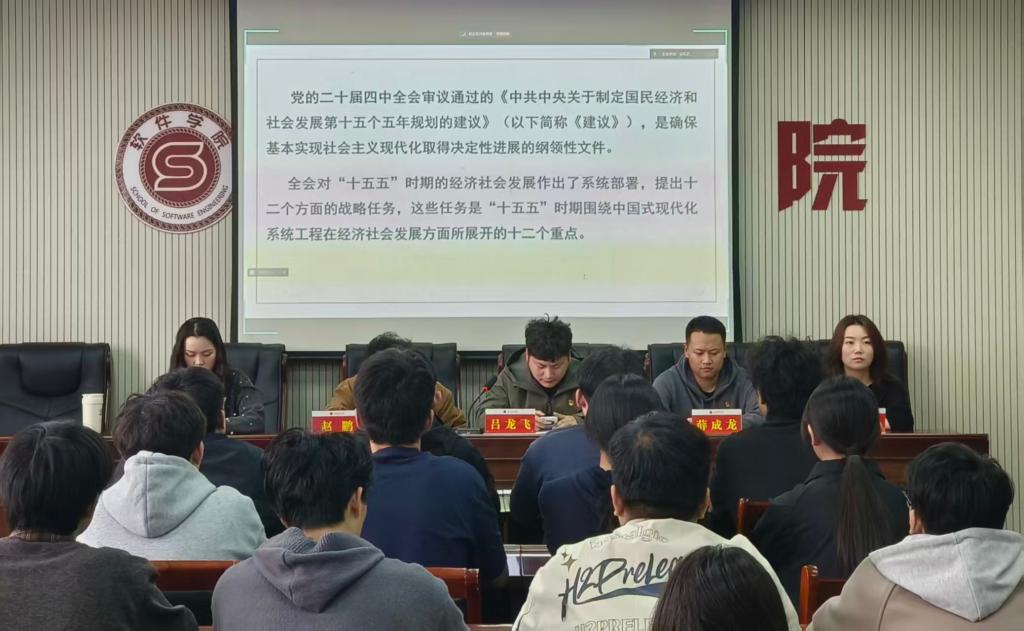 3月25日下午,软件学院学生第一党支部在教学楼202会议室举办党的二十届四中全会精神专题学习培训。支部书记吕龙飞,副书记赵鹏,组织委员兼纪检委员薛成龙,宣传委员段凤杰,以及梁安阁老师出席活动,支部全体学生党员参加培训。