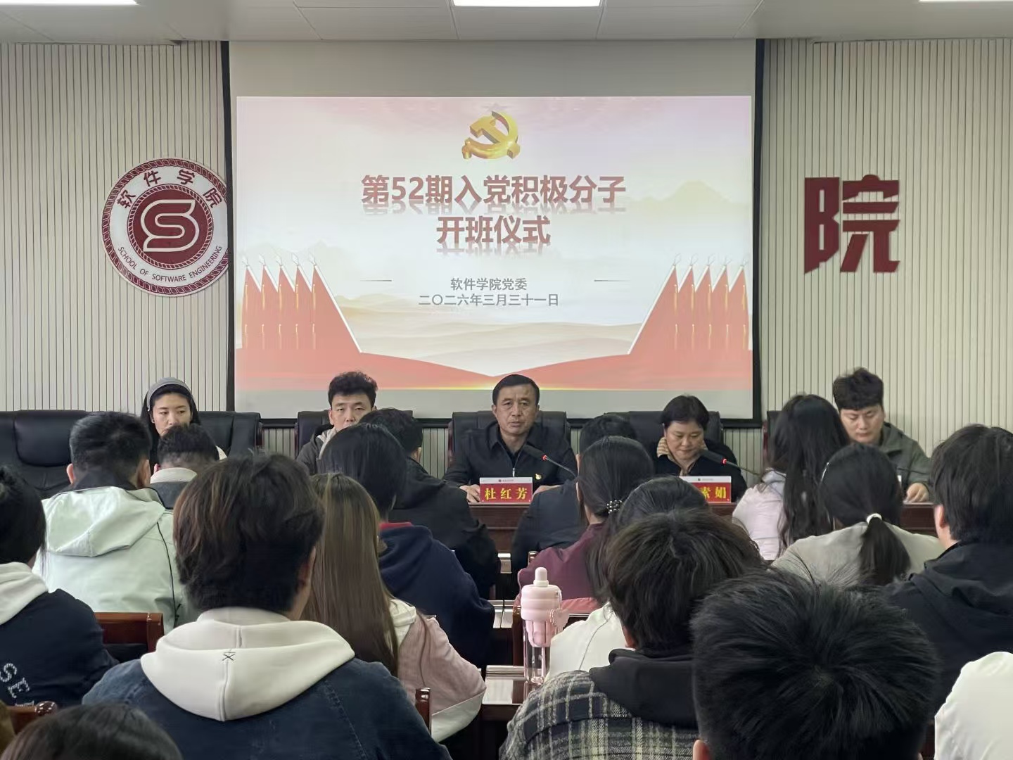 为切实做好对入党积极分子的培养教育工作,引导入党积极分子深刻领会党的二十大和二十届四中全会精神,提升政治素养与理论水平。经过认真地筹备与组织,软件学院于3月31日中午在教学楼202会议室举行第52期入党积极分子培训班开班仪式暨党课第一讲。软件学院党委书记杜红芳,软件学院党委副书记代素娟,学生党支部负责老师出席仪式。