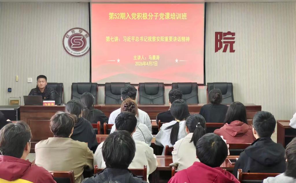 4月7日中午,软件学院学生第二党支部组织委员马晨涛同志在教学楼202会议室为第52期入党积极分子讲授以“习近平总书记视察安阳重要讲话精神”为主题的专题党课。